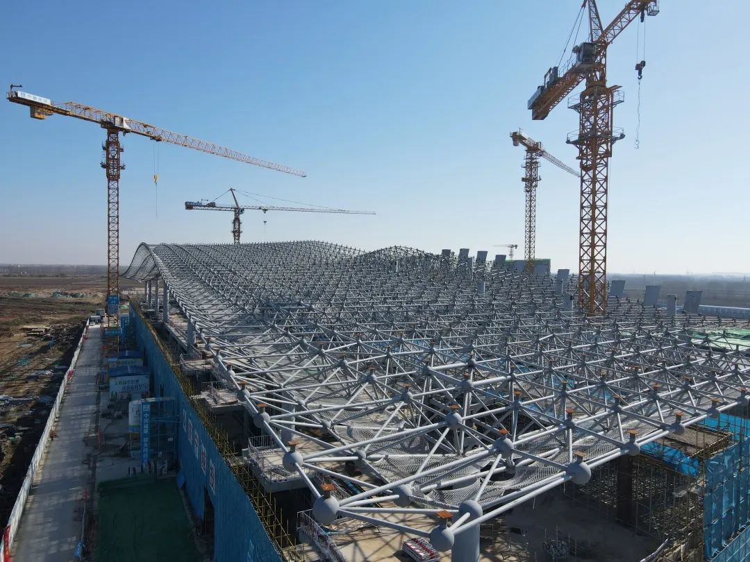 項(xiàng)目應(yīng)用智慧建造體系現(xiàn)場管理數(shù)字化、實(shí)時(shí)化、精確化,航站樓鋼網(wǎng)架屋蓋主體采用4643個(gè)焊接球、17932根桿件、網(wǎng)架重量達(dá)980.71噸、鋼結(jié)構(gòu)總用鋼量6000余噸,項(xiàng)目建立精確BIM模型,導(dǎo)入有限元力學(xué)分析軟件,測(cè)算桿件力學(xué)性能與面域受力情況,實(shí)測(cè)實(shí)量進(jìn)行偏差校核,將網(wǎng)架拼接誤差控制在毫米級(jí),最終完美演繹機(jī)場檐面。
