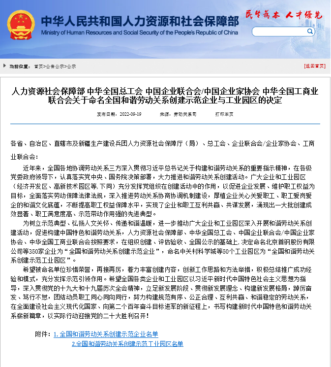 近日,人力資源和社會(huì)保障部、中華全國(guó)總工會(huì)、中國(guó)企業(yè)聯(lián)合會(huì)/中國(guó)企業(yè)家協(xié)會(huì)、中華全國(guó)工商業(yè)聯(lián)合會(huì)聯(lián)合印發(fā)關(guān)于命名全國(guó)和諧勞動(dòng)關(guān)系創(chuàng)建示范企業(yè)與工業(yè)園區(qū)的決定。