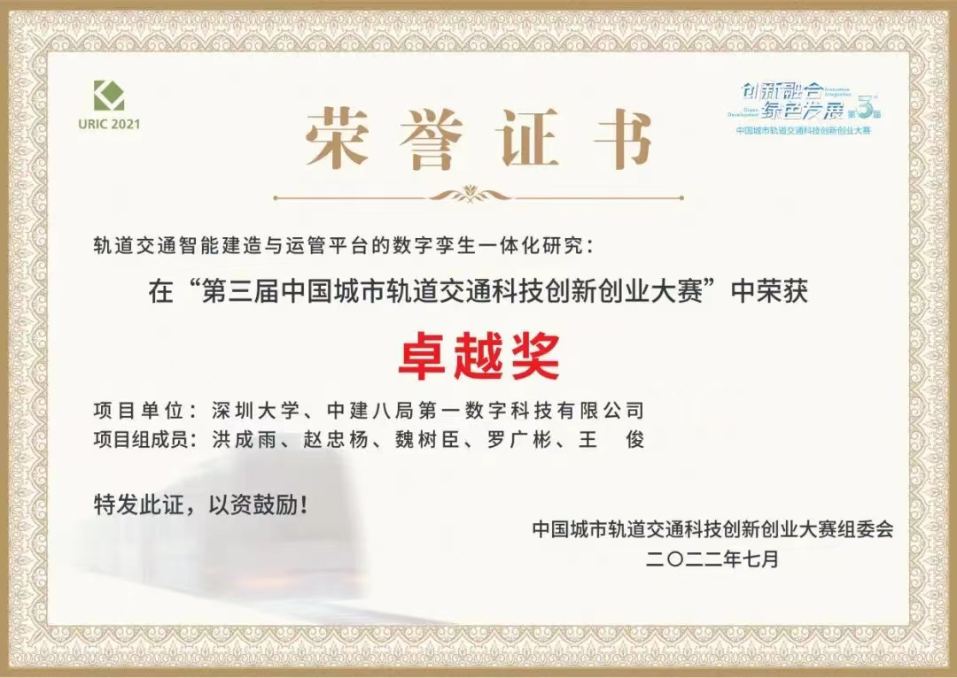 近日,第三屆中國城市軌道交通科技創(chuàng)新創(chuàng)業(yè)大賽全國總決賽暨頒獎盛典在北京圓滿舉行,一公司數(shù)字科技公司與深圳大學(xué)聯(lián)合創(chuàng)新的“軌道交通智能建造與運管平臺的數(shù)字孿生一體化研究”項目,榮獲總決賽基礎(chǔ)研究組最高獎“卓越獎”。