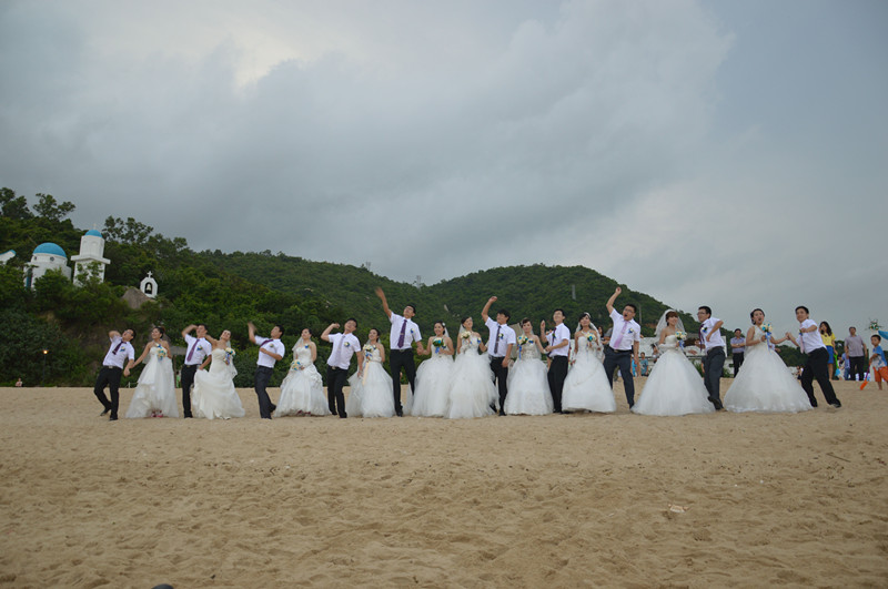 十位穿著潔白婚紗的美麗新娘,在新郎的牽手下走過鮮花交織的愛情長廊,經歷了“過低桿”、“梅花樁”、“越障礙”等重重考驗,共同拼出了“中建之藍,夢想之藍;浪漫海濱,一生相伴!”的婚禮主題詞。