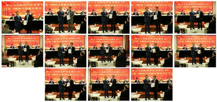 會上,濟南公司、華南公司、中原公司、裝飾公司四家二級單位書記作了工作述職。公司黨委書記、董事長董文祥代表公司黨委與13家二級單位簽訂并發(fā)放了《全面從嚴(yán)治黨責(zé)任書》、《精神文明建設(shè)責(zé)任書》。