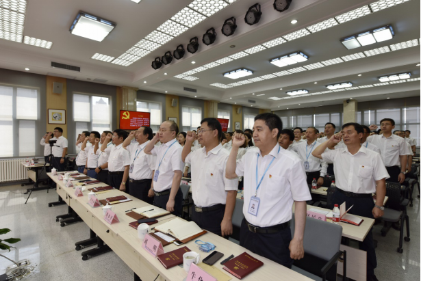 上午九點整,大會在雄壯的國歌聲中正式開始。隨后,在哈小平的領(lǐng)誓下,公司及各分會場黨員,面對鮮艷的中國共產(chǎn)黨黨旗,舉起右拳,重溫入黨誓詞。