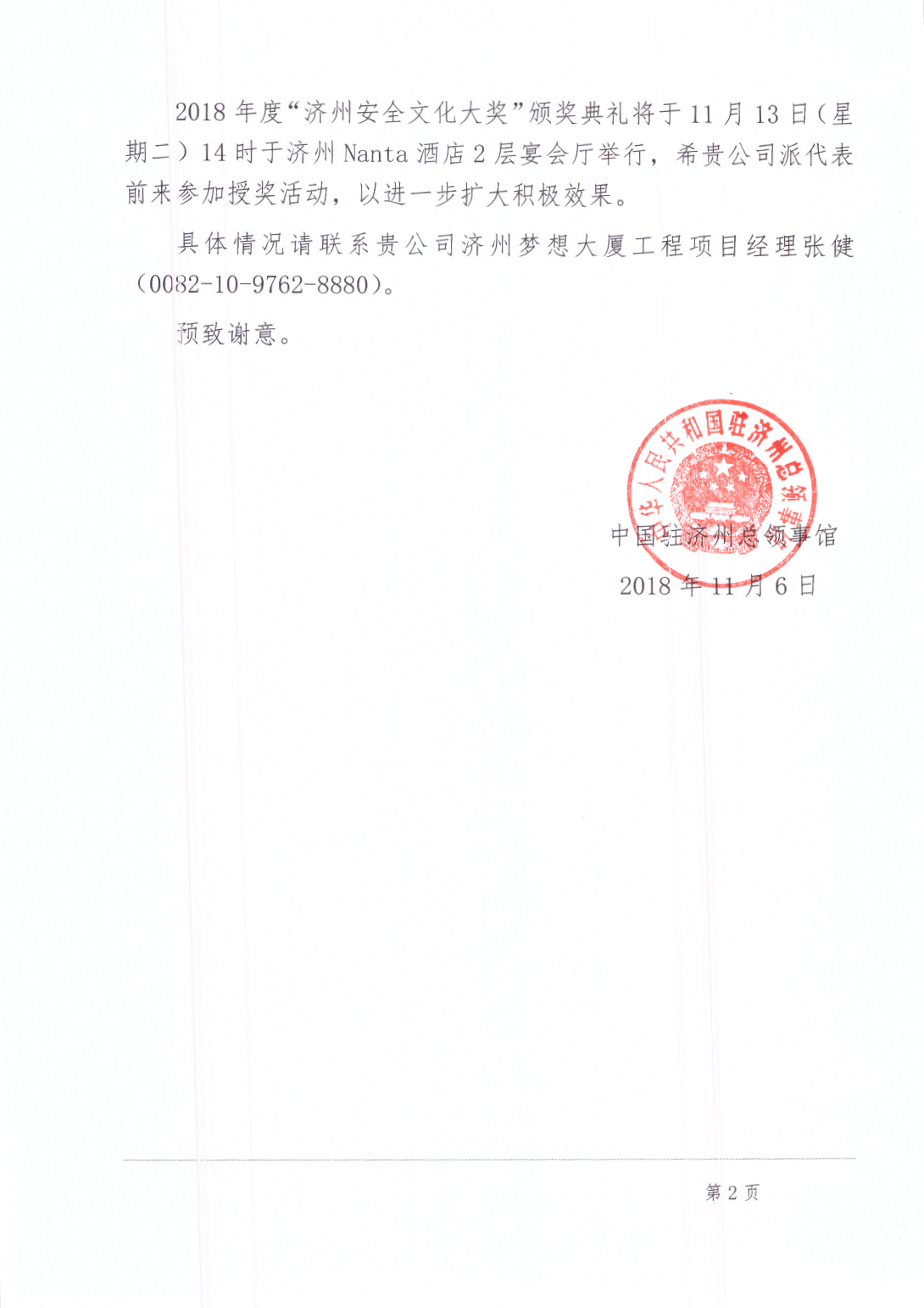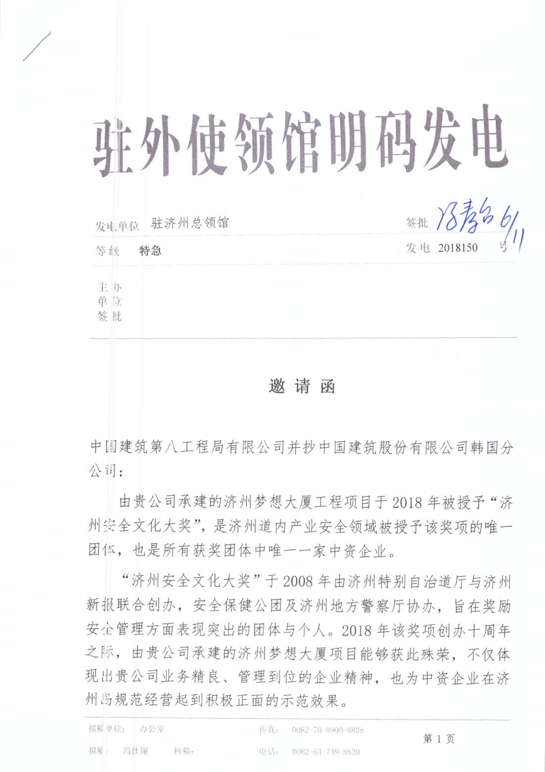 11月6日,駐外使領(lǐng)館明碼發(fā)電,濟(jì)州總領(lǐng)事馮春臺(tái)親自簽批邀請(qǐng)函,公司將作為濟(jì)州道內(nèi)產(chǎn)業(yè)安全領(lǐng)域被授予該獎(jiǎng)項(xiàng)的唯一團(tuán)體,也是唯一的中資獲獎(jiǎng)企業(yè),受邀參加13日在濟(jì)州Nanta酒店舉行的頒獎(jiǎng)典禮。