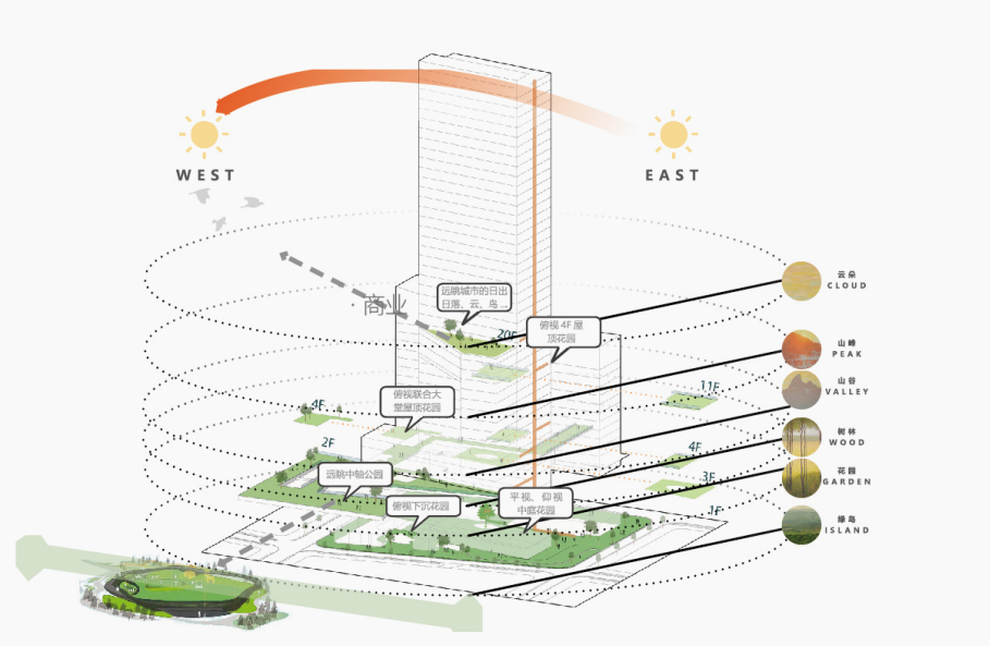 項(xiàng)目在景觀設(shè)計(jì)中遵循生態(tài)自然、開放多元、高效組織、以人為本的原則。通過線性的空間引導(dǎo),使人們歡聚于中心環(huán),形成了永續(xù)無界、回環(huán)流動(dòng)的空間體驗(yàn),實(shí)現(xiàn)人文與自然和諧共生。
