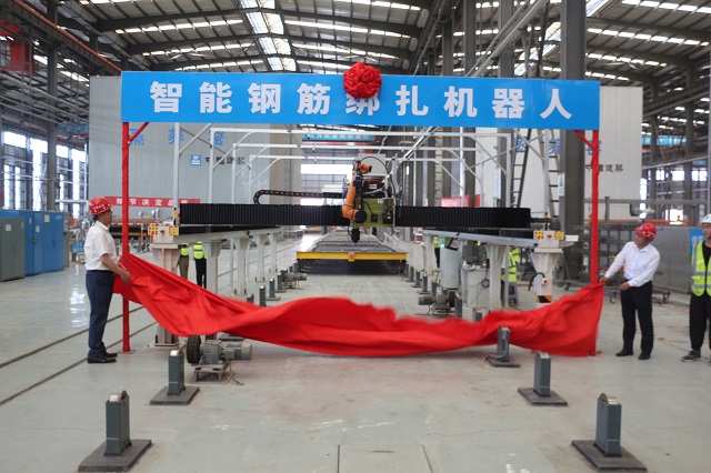 隨后,來到第六跨疊合板自動(dòng)化流水生產(chǎn)線,寧文忠、李鐵軍共同為智能鋼筋綁扎機(jī)器人揭彩。該機(jī)器人是一種可視覺導(dǎo)引的六軸鋼筋綁扎機(jī)器人,安放在流水線的鋼筋綁扎區(qū)域,能夠高效精準(zhǔn)的進(jìn)行鋼筋綁扎工作,具有自動(dòng)識(shí)別,精準(zhǔn)高效、協(xié)同作業(yè)、一機(jī)雙控等特點(diǎn),綁扎速度是人工的2倍,大大提高鋼筋綁扎效率。