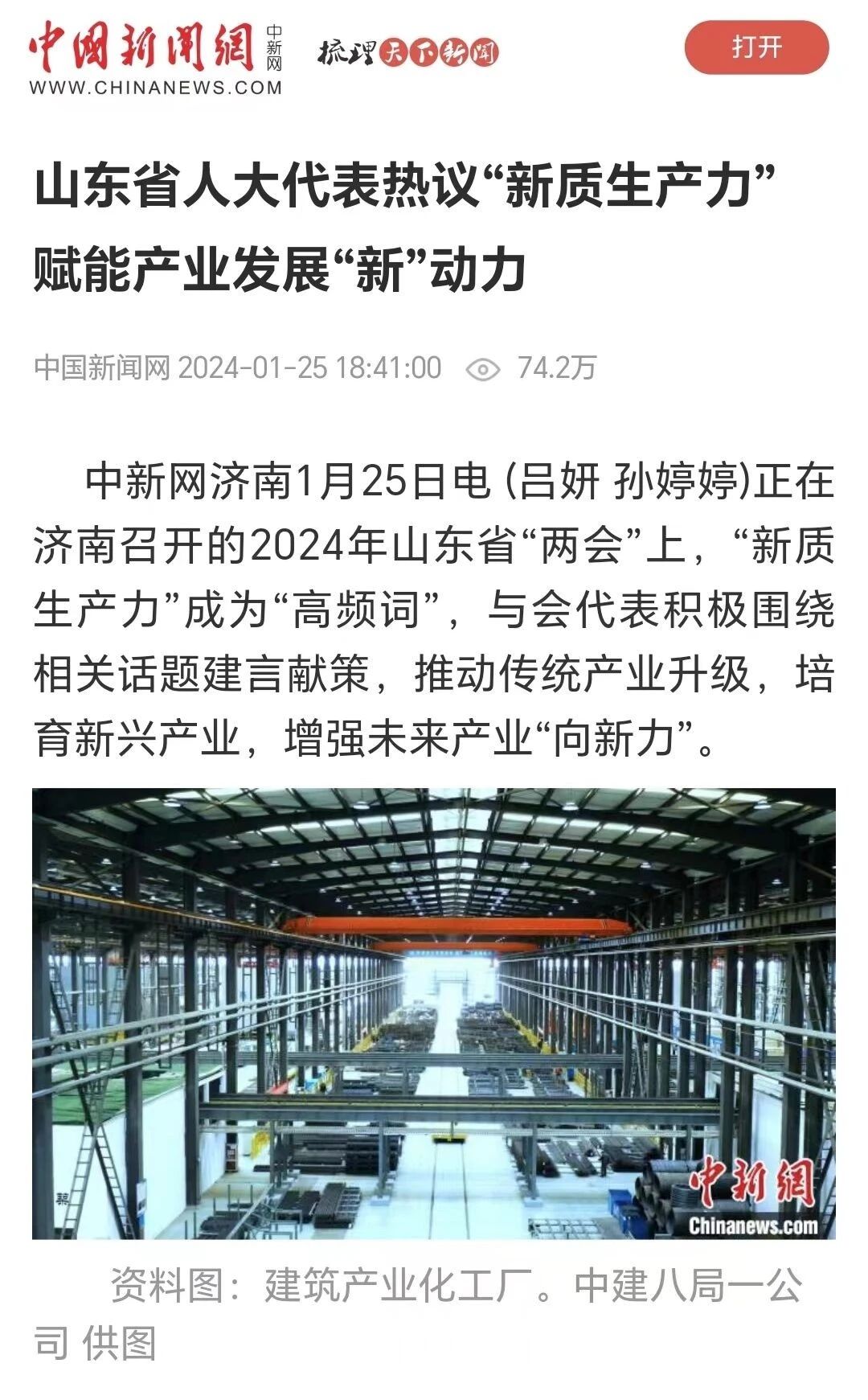 1月25日,2024年山東省“兩會”期間,中國新聞網(wǎng)刊發(fā)題為《山東省人大代表熱議“新質(zhì)生產(chǎn)力” 賦能產(chǎn)業(yè)發(fā)展“新”動力》的報道。山東省人大代表、中建八局一公司黨委書記、董事長齊朋就“新質(zhì)生產(chǎn)力”推動建筑業(yè)高質(zhì)量發(fā)展等相關(guān)問題分享了自己的觀點(diǎn)和建議。