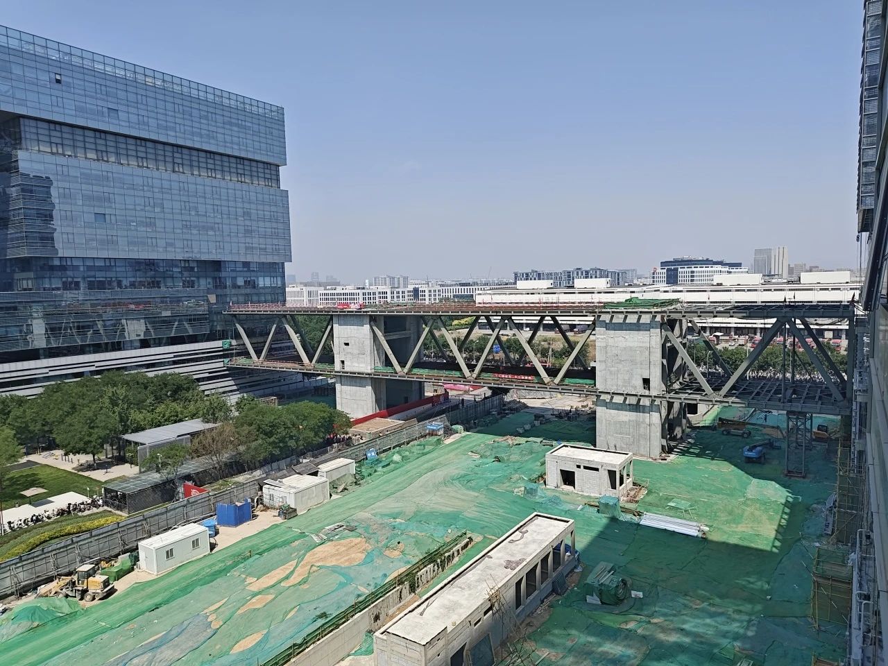 項目鋼結(jié)構(gòu)中庭屋面跨度達38.4米,需要130噸汽車吊完成施工,地下室底板需承擔較大荷載作用,為順利開展地下室回頂作業(yè),項目自主研發(fā)輪轂式鋼管束柱裝配支撐體系,極大提升中庭安裝效率,實現(xiàn)全過程高效生產(chǎn)。