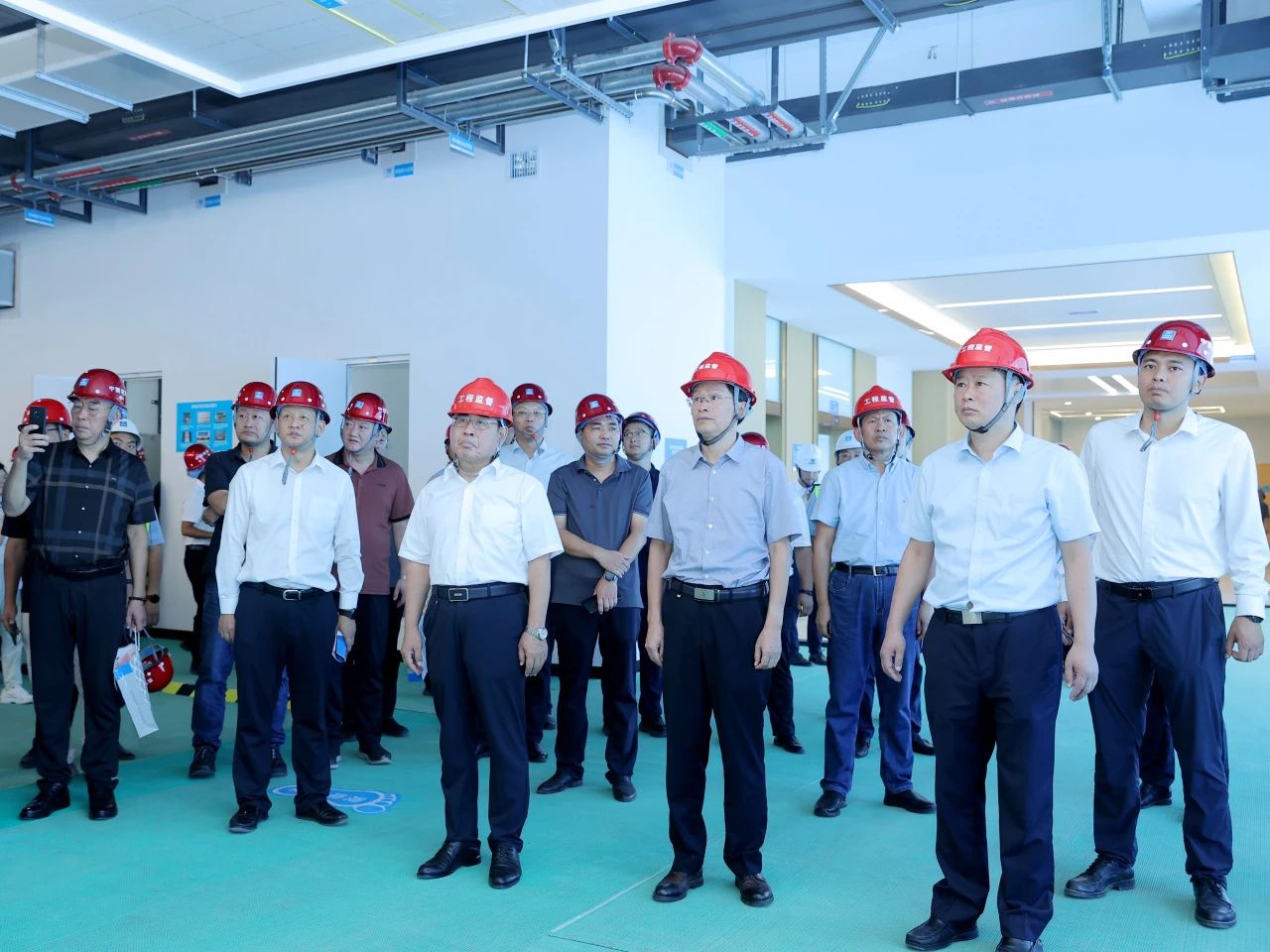 啟動儀式結(jié)束后,與會人員一同參觀了實體觀摩區(qū)及項目綜合展廳,就技術(shù)創(chuàng)新、質(zhì)量創(chuàng)優(yōu)、低碳建造、智慧工地等方面進行交流,對屋面、車庫地面、墻面等施工工序樣板及質(zhì)量亮點做法表示肯定。
