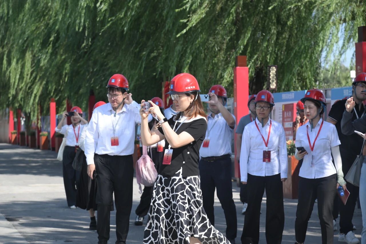培訓班學員分為四組,走進現(xiàn)場施工區(qū)和辦公生活區(qū),認真聽取現(xiàn)場講解,實地觀看項目建設現(xiàn)場、文化展廳、仿古花園式辦公區(qū)、黨員活動室、青年之家、工友幸福村等特色站點。