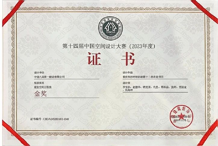 中建八局一公司榮獲2023年度中國(guó)建筑裝飾杰出商業(yè)空間設(shè)計(jì)機(jī)構(gòu),原創(chuàng)方案設(shè)計(jì)《重慶市沙坪壩區(qū)磁器十二巷全專業(yè)改造項(xiàng)目》榮獲商業(yè)空間工程類金獎(jiǎng),李寶存榮獲“福田杯”2023年度中國(guó)十大杰出建筑裝飾設(shè)計(jì)師。