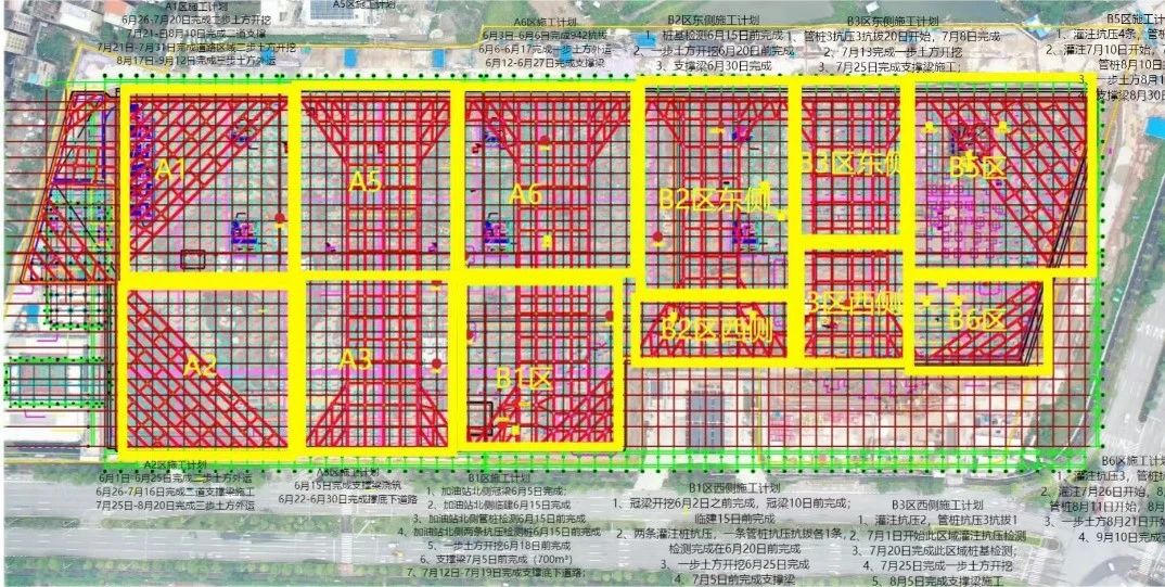 “網(wǎng)格化”也能破解安全管理難題,項(xiàng)目軟弱土層平均厚度22.9m、基坑深11m,地下水位較高,基坑安全管理難度較大。項(xiàng)目將基坑分為多個(gè)“網(wǎng)格”開挖,結(jié)合“網(wǎng)格”特點(diǎn)調(diào)整出土通道,對(duì)存在特殊危險(xiǎn)點(diǎn)的“網(wǎng)格”增設(shè)監(jiān)測(cè)點(diǎn),通過數(shù)據(jù)分析制定針對(duì)性舉措,保障基坑施工安全運(yùn)行。