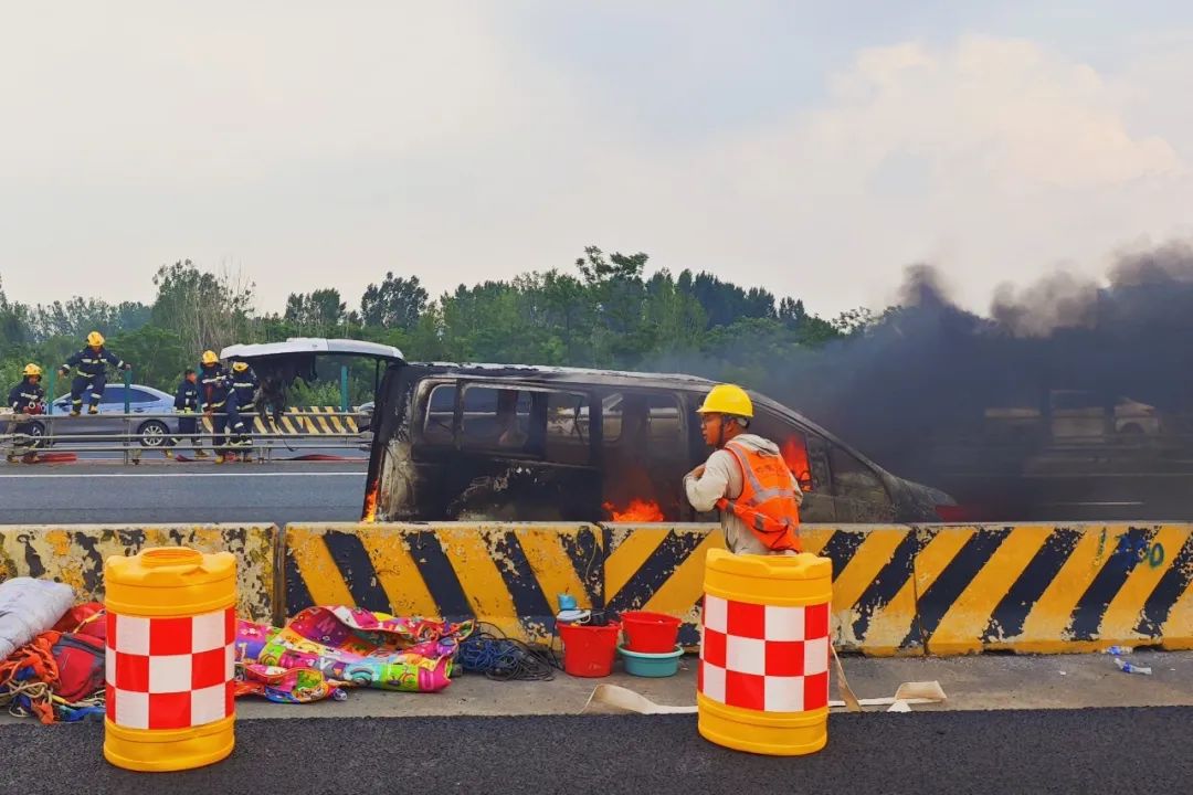 由于中建八局京臺(tái)高速齊濟(jì)段改擴(kuò)建項(xiàng)目緊鄰事發(fā)路段,項(xiàng)目現(xiàn)場(chǎng)工友第一時(shí)間發(fā)現(xiàn)火情并立即上報(bào)項(xiàng)目部。接到報(bào)告后,項(xiàng)目部迅速啟動(dòng)應(yīng)急預(yù)案,管理人員即刻調(diào)派距離現(xiàn)場(chǎng) 5 公里的場(chǎng)站灑水車,同時(shí)組織在場(chǎng)管理人員與工友配合交警開展人群疏散和交通管制工作,為后續(xù)救援爭(zhēng)取寶貴時(shí)間。15 分鐘后,灑水車順利抵達(dá)現(xiàn)場(chǎng),初步控制住火情蔓延態(tài)勢(shì)。