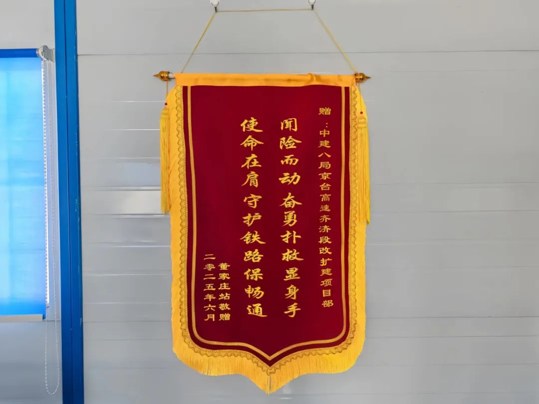 據(jù)了解,這并非該項(xiàng)目部首次參與緊急救援。2025 年 5 月,濟(jì)南董家莊站線路外側(cè)曾突發(fā)火情,著火點(diǎn)距運(yùn)行鐵路不足 15 米,火借風(fēng)勢(shì)快速蔓延,一旦失控將直接威脅列車安全。該項(xiàng)目部人員接到通知后,迅速調(diào)集灑水車、挖掘機(jī)趕赴現(xiàn)場(chǎng),按照預(yù)案分工協(xié)作、科學(xué)撲救,不僅快速撲滅火情,還徹底消除復(fù)燃風(fēng)險(xiǎn),保障了鐵路行車安全。事后,濟(jì)南董家莊站特意贈(zèng)予項(xiàng)目部 “使命在肩守護(hù)鐵路保暢通,臨險(xiǎn)而動(dòng)奮勇?lián)渚蕊@身手” 錦旗,以表感謝。