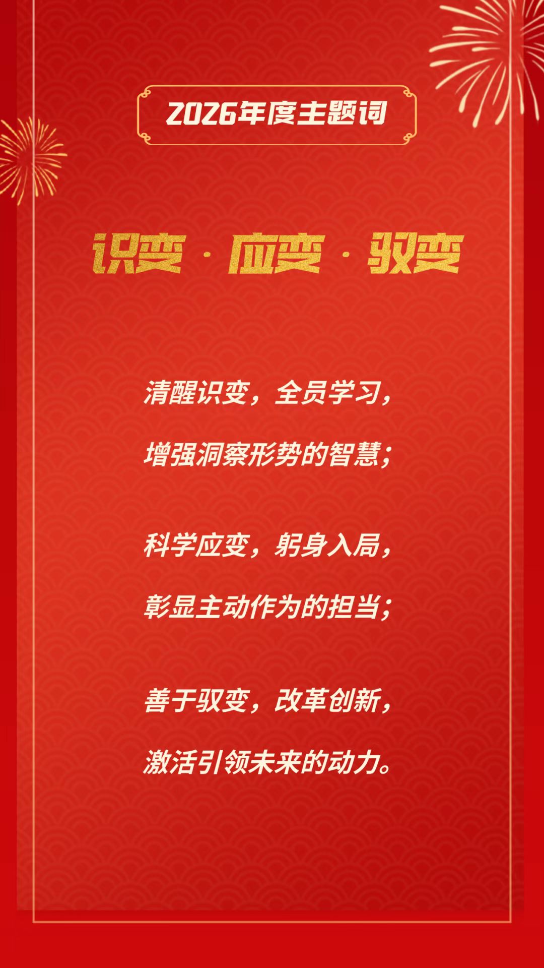 1月1日,公司發(fā)布2026年度主題詞——識變?應(yīng)變?馭變。清醒識變,全員學(xué)習(xí),增強(qiáng)洞察形勢的智慧;科學(xué)應(yīng)變,躬身入局,彰顯主動作為的擔(dān)當(dāng);善于馭變,改革創(chuàng)新,激活引領(lǐng)未來的動力。