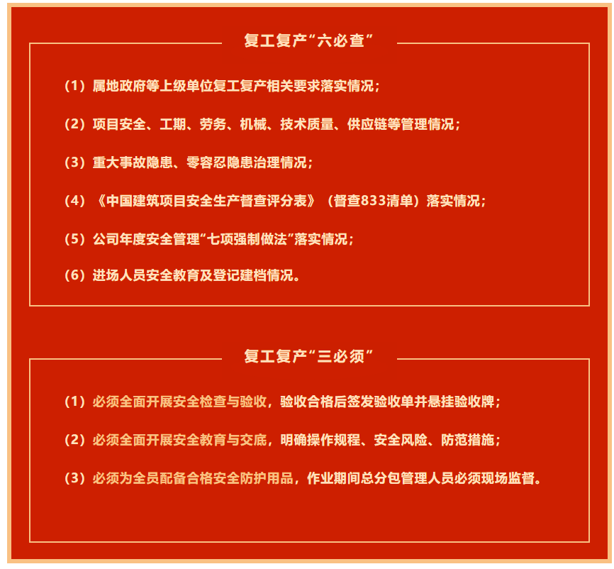 公司2026年春節(jié)后復(fù)工安全生產(chǎn)大檢查啟動(dòng),嚴(yán)守底線、不越紅線、平穩(wěn)復(fù)工,安全生產(chǎn)“六必查”“三必須”請(qǐng)查收。