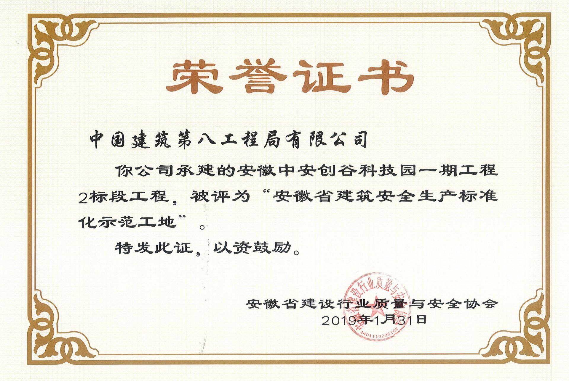 中安創(chuàng)谷科技園一期工程2標(biāo)段項(xiàng)目經(jīng)過(guò)項(xiàng)目管理人員的不懈努力,項(xiàng)目于2018年8月8日通過(guò)安徽省合肥市建筑安全生產(chǎn)標(biāo)準(zhǔn)化示范工地驗(yàn)收工作,2018年9月20日順利通過(guò)安徽省建筑安全生產(chǎn)標(biāo)準(zhǔn)化示范工地驗(yàn)收,2019年2月26日取得“安徽省建筑安全生產(chǎn)標(biāo)準(zhǔn)化示范工地”榮譽(yù)稱(chēng)號(hào)。