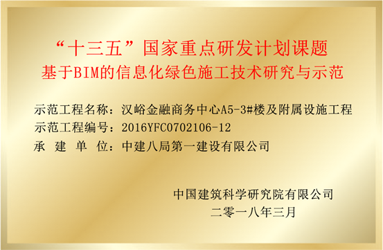8月15日,漢峪金融商務中心A5-3#樓及附屬設施工程“雙喜臨門”,由中國建筑科學研究院頒發(fā)的“十三五”國家重點研發(fā)計劃課題《基于BIM的信息化綠色施工技術研究與示范》銅牌和中建八局頒發(fā)的“二0一八年度科技成果轉化示范工程”銅牌在我項目成功掛牌立項。