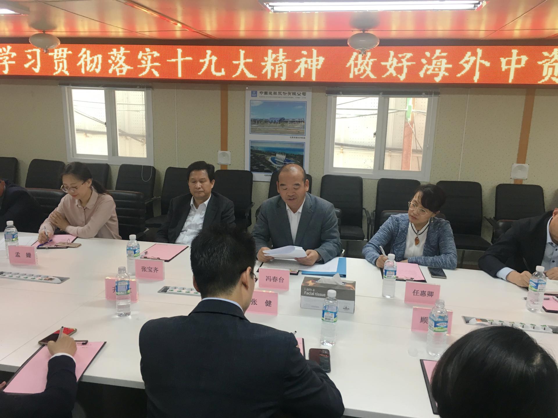 5月21日,中國(guó)駐濟(jì)州總領(lǐng)館與濟(jì)州中國(guó)商會(huì)黨建工作交流會(huì)在由中建八局承建的濟(jì)州夢(mèng)想大廈新建工程項(xiàng)目舉行。 中國(guó)駐濟(jì)州總領(lǐng)館總領(lǐng)事馮春臺(tái)、副總領(lǐng)事張寶齊、領(lǐng)事任惠卿、副領(lǐng)事吳錫路、副領(lǐng)事孟珊一行到會(huì)指導(dǎo),濟(jì)州中國(guó)商會(huì)會(huì)長(zhǎng)、夢(mèng)想大廈項(xiàng)目經(jīng)理張健、綠地總指揮顧霞芳、國(guó)航代表齊永軍、東航代表魯韻梓等17位中資企業(yè)黨員參加了此次會(huì)議。