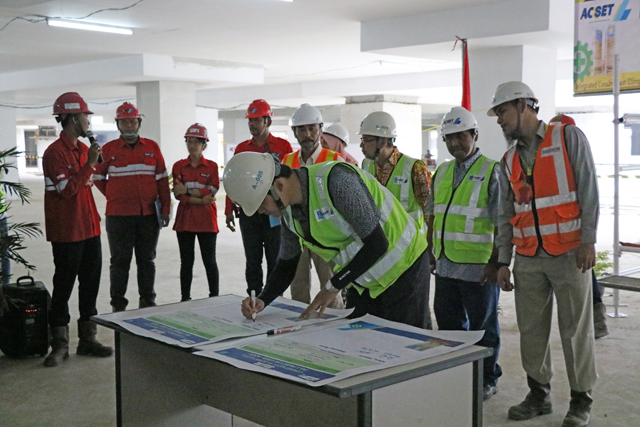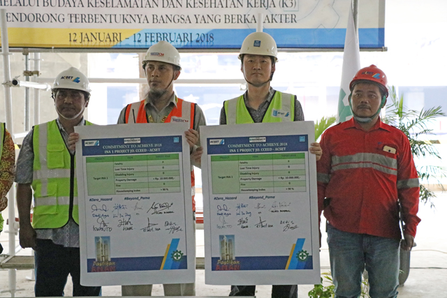 早上七時三十分,活動正式開始,主持人致辭并宣讀了本年度安全生產(chǎn)月活動主題及啟動儀式的主要流程?;顒觾x式上,總監(jiān)理工程師Dedi宣讀了印尼勞工部關(guān)于建筑行業(yè)安全生產(chǎn)的相關(guān)法律和法規(guī),安全部經(jīng)理Iswanto就2017年項目安全生產(chǎn)活動進(jìn)行總結(jié)報告,詳細(xì)回顧了過去一年里項目在安全管理方面取得的一系列成績,并就2018年安全管理目標(biāo)進(jìn)行了展望。活動還對項目2018年度安全生產(chǎn)活動進(jìn)行了詳細(xì)部署,項目經(jīng)理劉嘉東等主要管理人員簽訂了目標(biāo)責(zé)任狀。