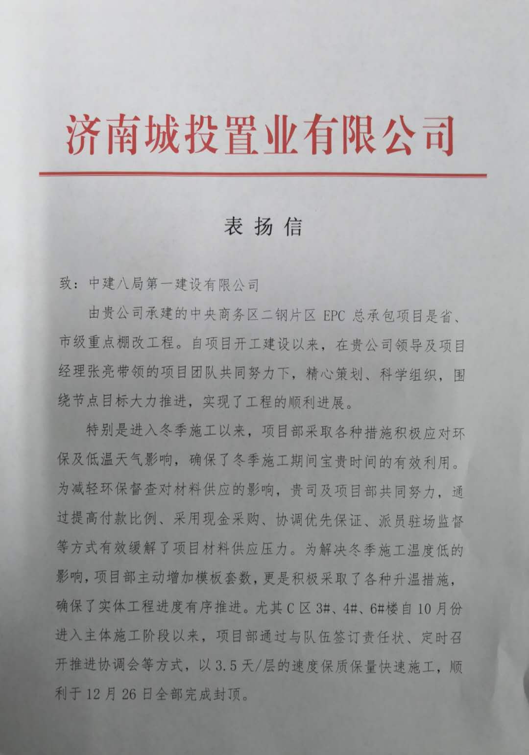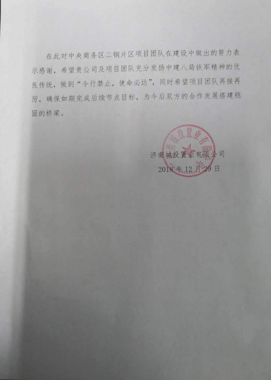 1月5日上午,中央商務(wù)區(qū)安置區(qū)項目收到濟(jì)南城投置業(yè)有限公司的表揚(yáng)信。
