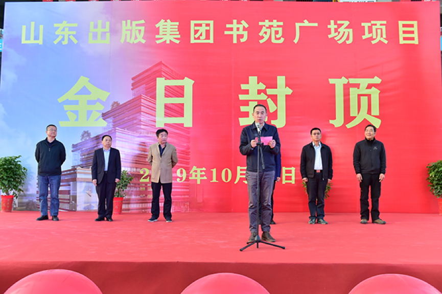 接下來,李濤在致辭中對(duì)公司的支持、配合以及項(xiàng)目部全體員工的辛勤付出表示感謝,并宣布山東出版集團(tuán)圖書展示樓項(xiàng)目主體結(jié)構(gòu)順利封頂。