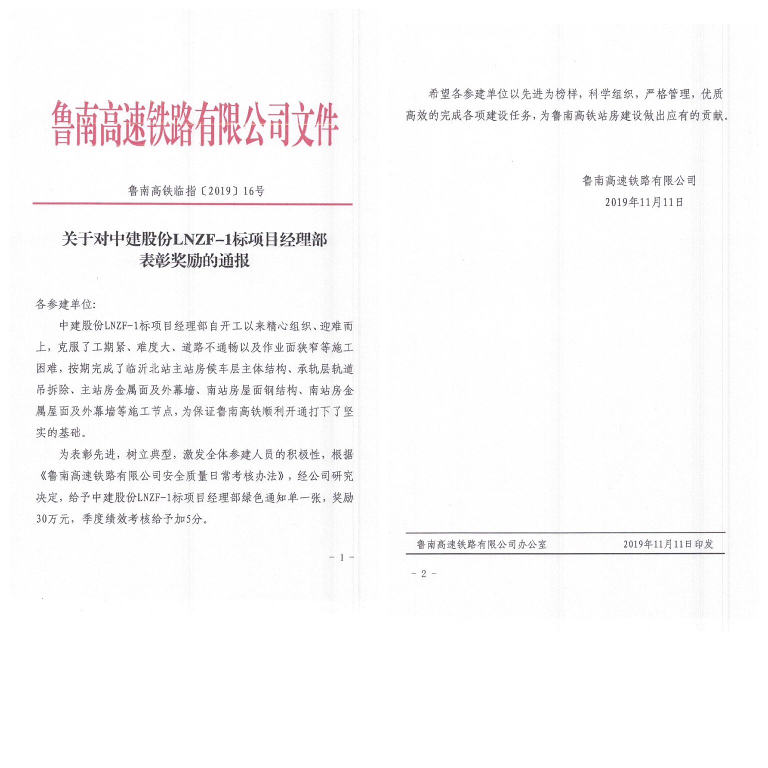 2019年11月13日,魯南高鐵站房項(xiàng)目收到魯南高速鐵路有限公司發(fā)來(lái)的表彰通報(bào),表?yè)P(yáng)項(xiàng)目順利完成各項(xiàng)關(guān)鍵節(jié)點(diǎn)施工任務(wù),獎(jiǎng)勵(lì)綠色通知單一張,季度績(jī)效考核加5分。