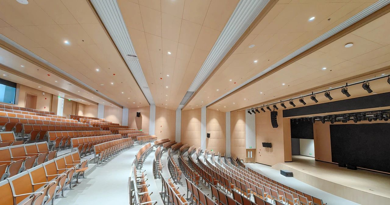 行政樓報(bào)告大廳大氣亮堂,可容納800多人,天花板和墻面采用吸音板和聲音反射、擴(kuò)散材料,在增強(qiáng)隔音的同時提升室內(nèi)聲音傳播效果。