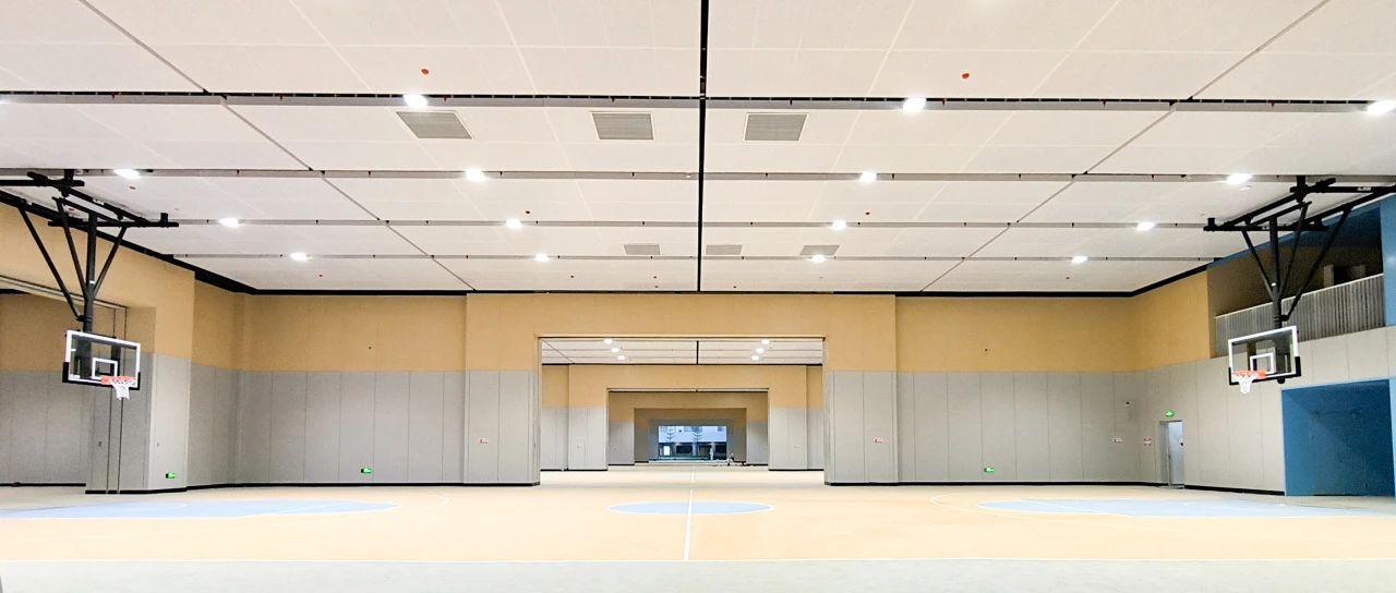 足球場底部以“架空層”的形式,共設(shè)有8個標(biāo)準(zhǔn)籃球場,天花板采用白色穿孔吸音鋁板,球場墻面底部為灰色護(hù),墻板上部為木紋紅波吸聲板,休息區(qū)為藍(lán)色鋁板場地色彩活潑明快,空間隔音效果絕佳。