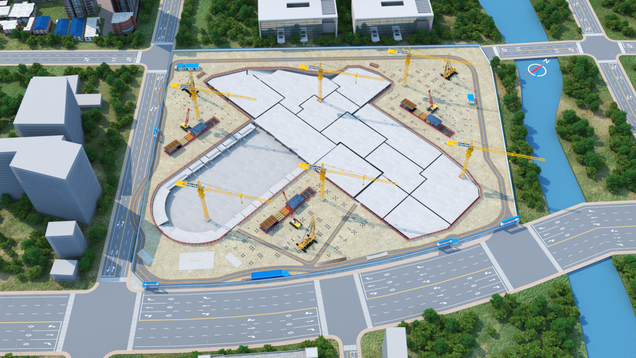 項(xiàng)目為半地下室切割施工,現(xiàn)場施工區(qū)域分段較多,同時首層多為架空層,各單體銜接測量精度要求高,項(xiàng)目借助學(xué)校整體BIM模型,提前規(guī)劃項(xiàng)目施工平面布置,合理布置材料堆場與施工道路,結(jié)合現(xiàn)場實(shí)際進(jìn)度,適時調(diào)整場地平面布置轉(zhuǎn)換。