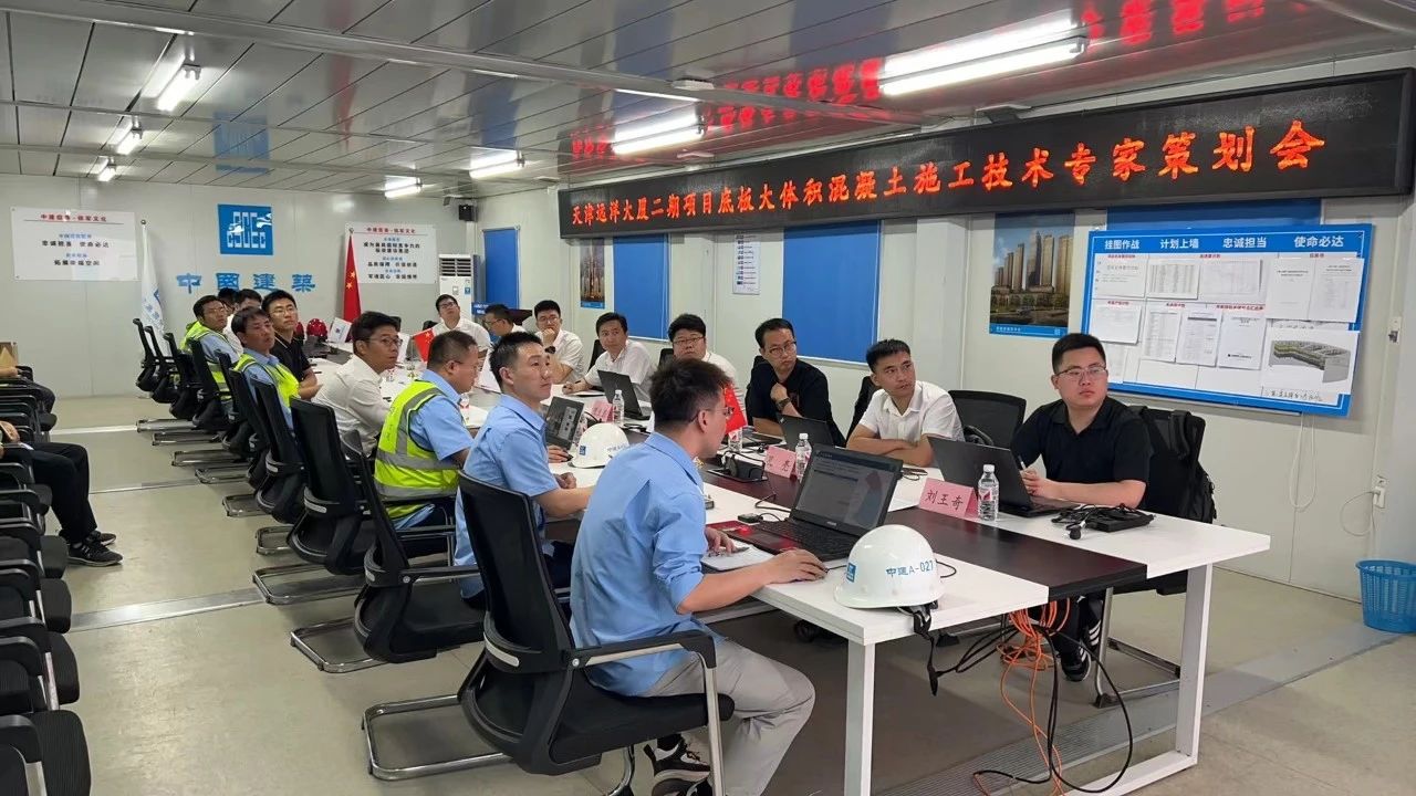 針對3.2米超厚底板,協(xié)調(diào)組織經(jīng)驗(yàn)豐富的專家團(tuán)隊(duì)實(shí)地勘察現(xiàn)場進(jìn)行技術(shù)策劃,提出支撐梁掛設(shè)無動力溜管澆筑法優(yōu)化建議,積極協(xié)同相關(guān)參建方開展基礎(chǔ)底板施工方案論證會,針對鋼筋支架、混凝土配合比試配,水化熱驗(yàn)算、溫差控制與混凝土養(yǎng)護(hù)等全過程進(jìn)行細(xì)致梳理,為項(xiàng)目大體積混凝土澆筑掃清障礙。