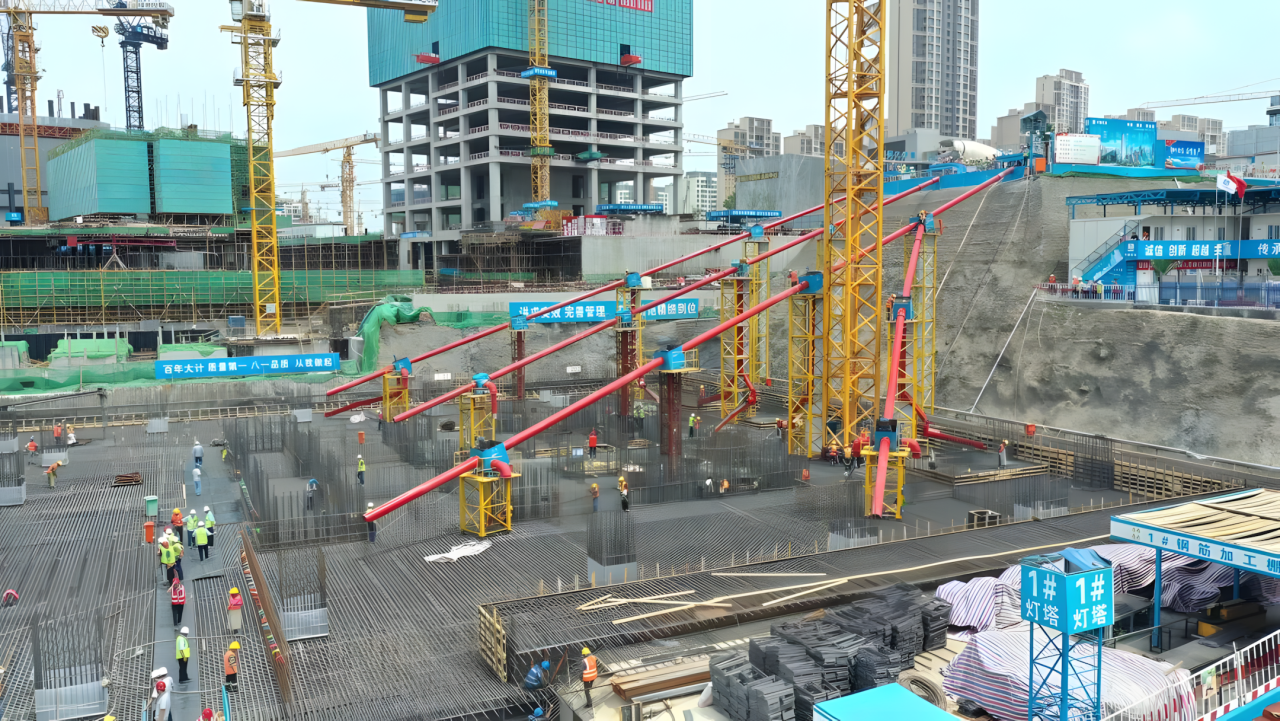 項(xiàng)目基礎(chǔ)筏板最大厚度7.7米,筏板混凝土總方量超1萬(wàn)立方米,項(xiàng)目創(chuàng)新研發(fā)“全過(guò)程無(wú)間歇溜管法澆筑技術(shù)”,120輛攪拌車(chē)不間斷作業(yè)14小時(shí),完成1萬(wàn)立方米混凝土澆筑,刷新當(dāng)時(shí)山東省混凝土澆筑最快速度,技術(shù)成果達(dá)到國(guó)際領(lǐng)先水平。