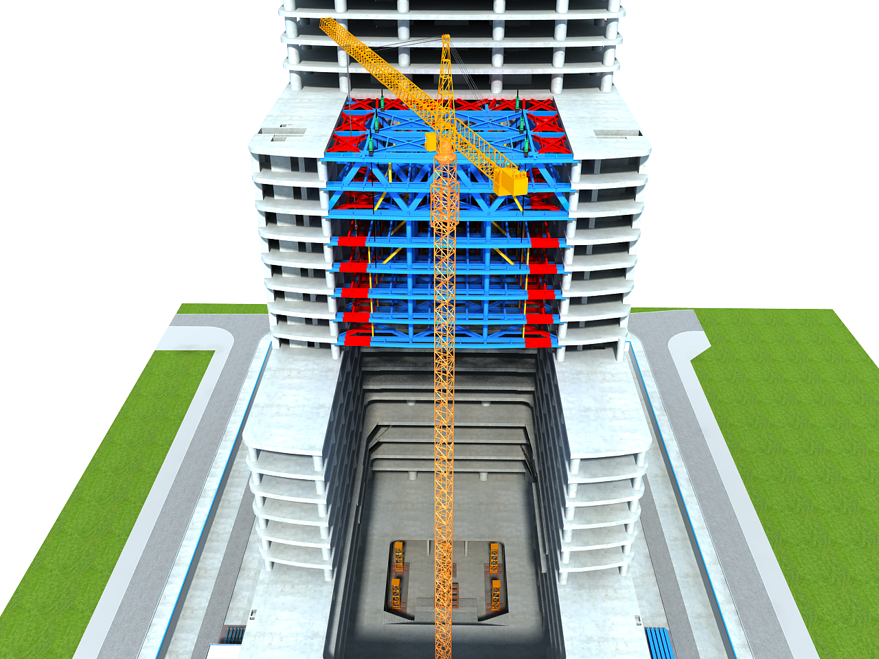鋼連廊提升過程中,項(xiàng)目團(tuán)隊(duì)設(shè)置6個(gè)提升支架,每處支架安裝兩臺(tái)提升設(shè)備,提升設(shè)備由電子設(shè)備集中控制,可準(zhǔn)確完成數(shù)據(jù)反饋和控制指令傳遞,實(shí)現(xiàn)同步動(dòng)作、負(fù)載均衡、姿態(tài)矯正、應(yīng)力控制、操作閉鎖、過程顯示和故障報(bào)警,同時(shí)應(yīng)用多項(xiàng)先進(jìn)施工技術(shù),通過模擬計(jì)算,實(shí)現(xiàn)分段整體提升和高空散拼裝,有效結(jié)合解決了有限空間下大跨度超高層鋼連廊施工難題,保障鋼連廊順利提升。