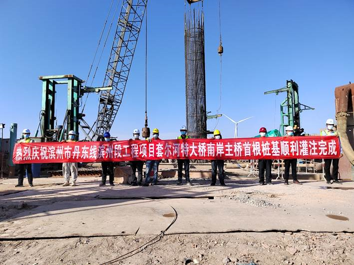 2022年5月21日,隨著最后一方混凝土灌入導(dǎo)管,濱州G228項(xiàng)目套爾河特大橋南岸主墩首根樁基順利灌注完成,標(biāo)志著濱州G228項(xiàng)目套爾河特大橋南岸正式進(jìn)入主體施工階段。