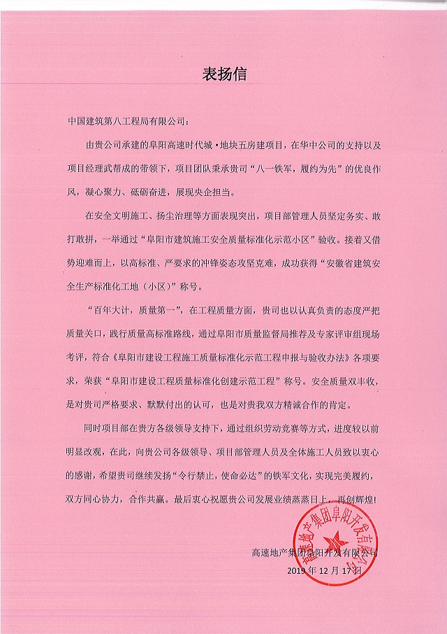 阜陽(yáng)高速·時(shí)代城項(xiàng)目收到業(yè)主表?yè)P(yáng)信