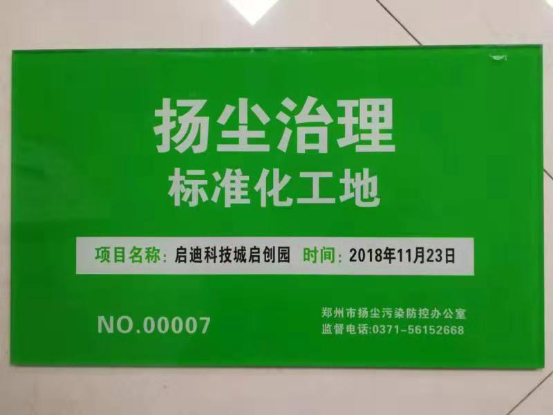 2018年11月27日,鄭州市舉行首批揚塵治理標準化工地授牌儀式,鄭州啟迪科技城啟創(chuàng)園項目被授予鄭州市首批“揚塵治理標準化工地”掛牌(俗稱“綠牌”)。