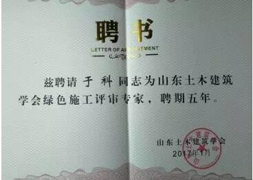 2017年9月25日,山東土木建筑學(xué)會(huì)施工專(zhuān)業(yè)委員會(huì)第九屆會(huì)員代表大會(huì)在濟(jì)召開(kāi),會(huì)議選舉產(chǎn)生了第九屆全委會(huì),公司當(dāng)選主任委員單位,總工程師于科被聘為山東土木建筑學(xué)會(huì)綠色施工評(píng)審專(zhuān)家。