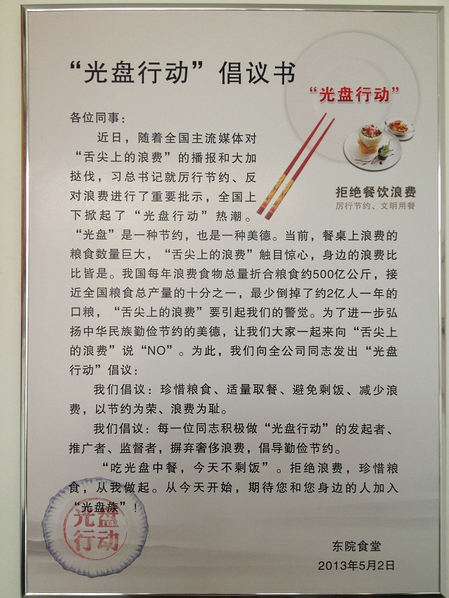 “加入‘光盤行動’,節(jié)約從我做起”,“拒絕舌尖上的浪費(fèi),從這里做起!”,近日,一公司濟(jì)南分公司職工食堂的墻面上一份倡議書,一幅幅的宣傳標(biāo)語,吸引了不少前來就餐職工的眼球。