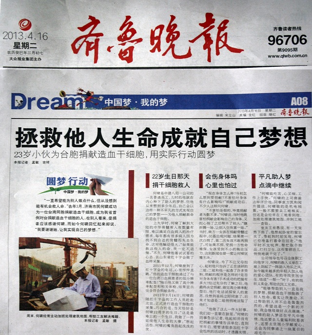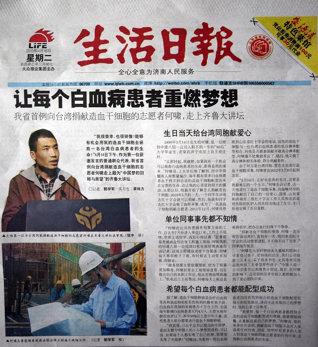 近日,一公司員工何嘯成為第一次獲邀在齊魯大講壇發(fā)言的普通群眾,講述了自己捐獻(xiàn)骨髓救助臺灣同胞的事跡,引起了現(xiàn)場觀眾的熱烈掌聲。何嘯的事跡也引起了齊魯晚報(bào)、山東生活日報(bào)等大媒體的關(guān)注。近日,兩大媒體記者趕赴一公司進(jìn)行采訪,并于16號的報(bào)紙中大篇幅報(bào)道了何嘯的事跡。