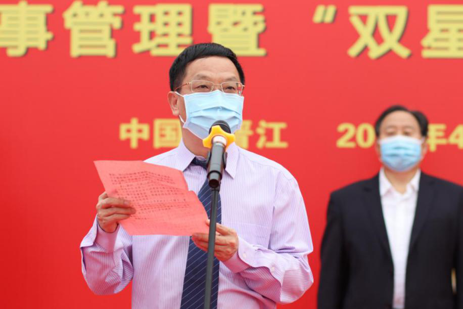 各級(jí)領(lǐng)導(dǎo)共同觸摸啟動(dòng)球并宣布晉江新絲路文教園項(xiàng)目勞動(dòng)競(jìng)賽、“三號(hào)聯(lián)創(chuàng)”、準(zhǔn)軍事管理暨“雙星”活動(dòng)正式啟動(dòng)。