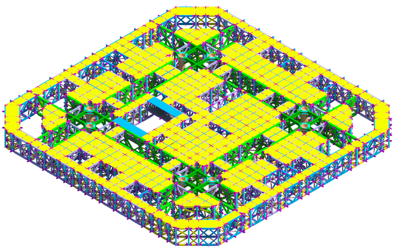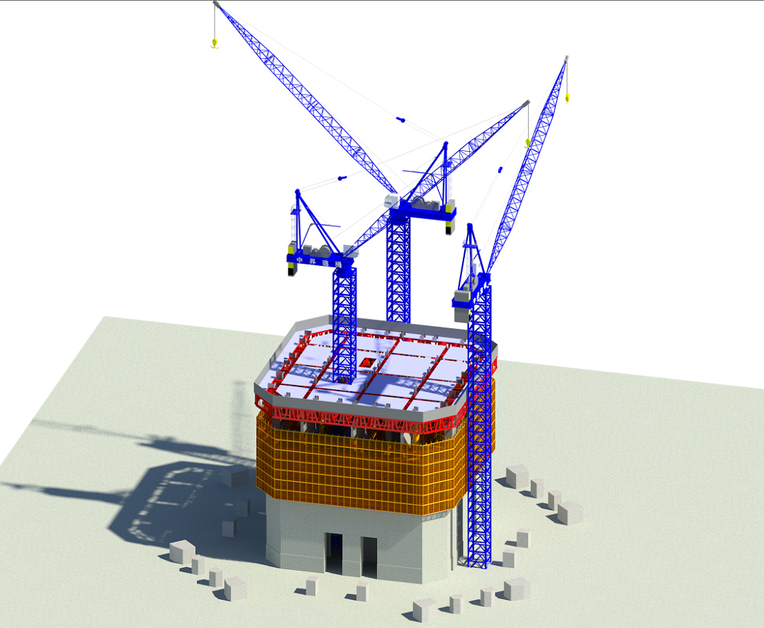 項(xiàng)目因此計(jì)劃研發(fā)智能化整體提升平臺施工。該頂升平臺能夠?qū)崿F(xiàn)施工集成,將施工電梯直達(dá)平臺、卸料平臺、混凝土布料溜管、臨時(shí)設(shè)施、物料堆場等與平臺的融合,優(yōu)化資源配置,減少設(shè)備之間運(yùn)行的干擾,提升施工速度;利用墻體預(yù)埋鋼盒,油缸支撐系統(tǒng)附著墻體,保證平臺承載力,同時(shí)可抵御高空風(fēng)荷載作用。通過優(yōu)化設(shè)計(jì),外掛架開合伸縮機(jī)構(gòu),解決墻體內(nèi)收、傾斜、伸臂桁架、預(yù)埋附墻件等復(fù)雜情況下的平臺爬升;全方位實(shí)時(shí)監(jiān)控平臺工作運(yùn)行狀態(tài),具有預(yù)警功能。